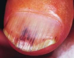 Finally, splinter hemorrhages are longitudinal hemorrhagic bands under the nail. Splinter hemorrhages are common in infective endocarditis.